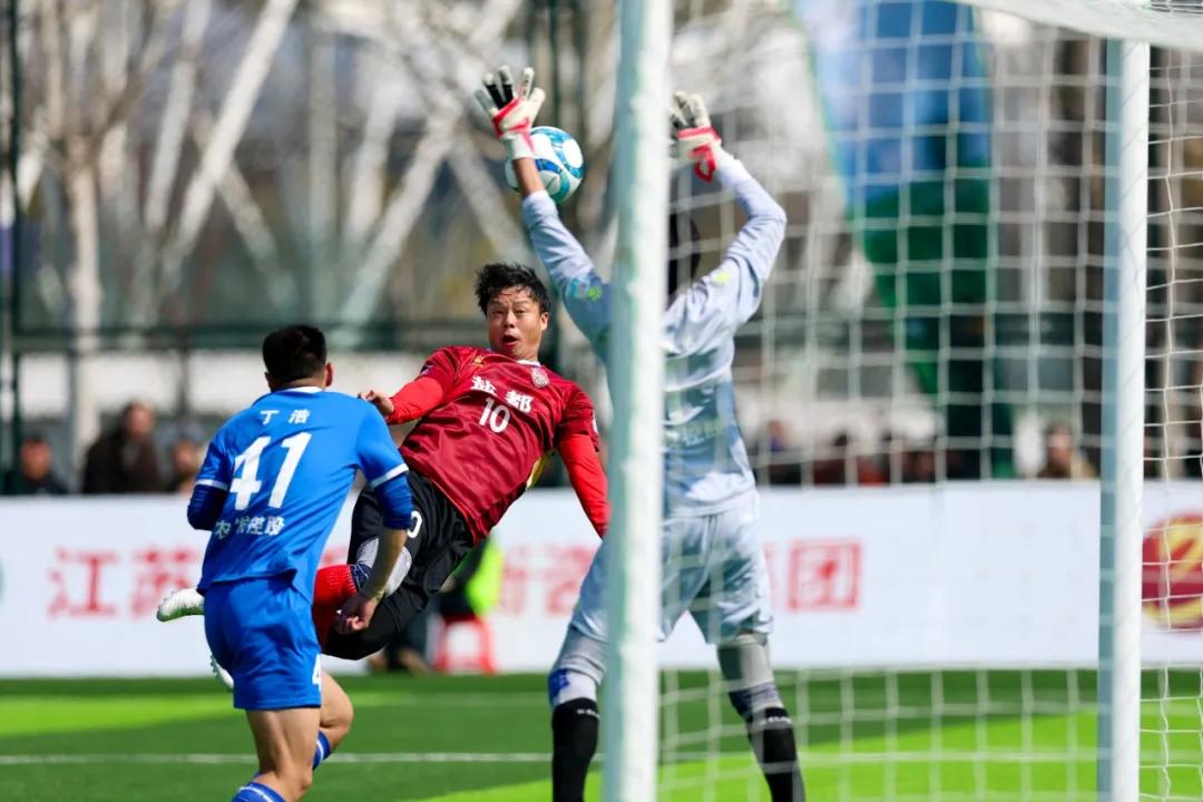 (3月14日主场首战,盐都队10号球员蔡培雷进球得分,为盐都队进了开赛第一球。宋从勇 摄)